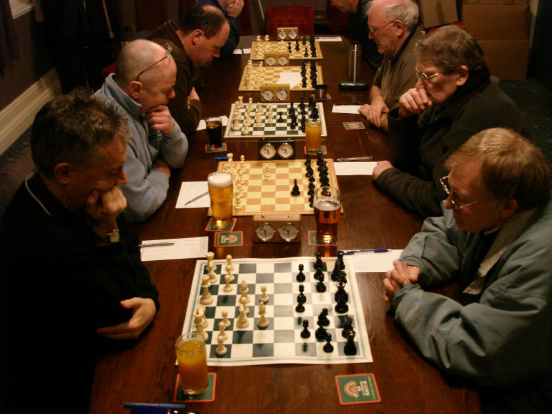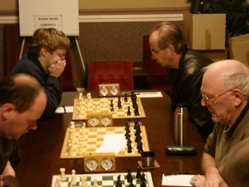 [left further] Dave Gray played a good positional game, obtained an endgame advantage a pawn to the good, and defeated section 2a holder Roger Tuddenham [further right].