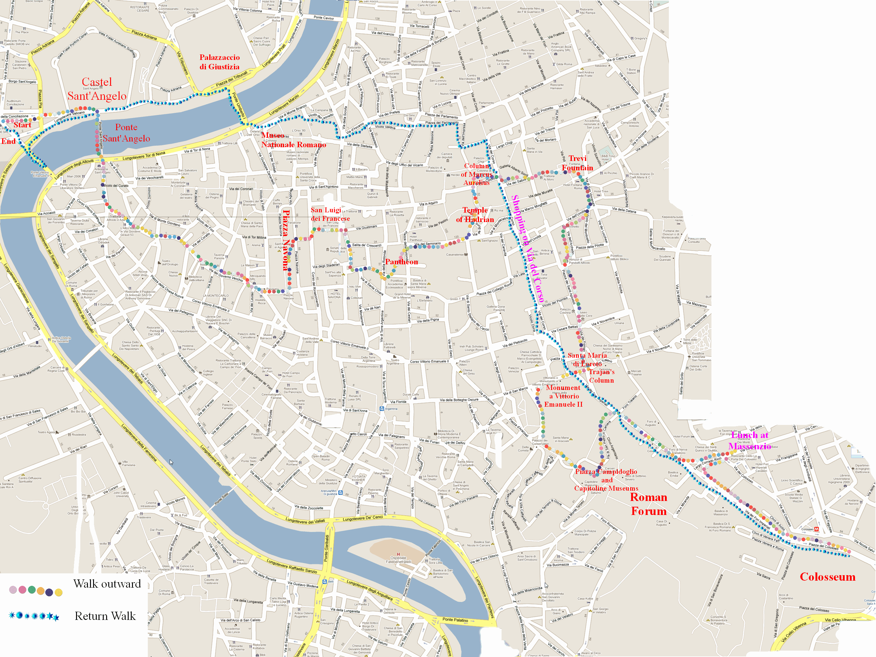 I planned the trip by identifying about 20 places I wanted to visit in central Rome using the Rome2Go app. I "pinned" these places on the app map and planned the most efficient way of walking through Rome. This route can be seen on the map. Since the app has GPS we always knew our location by using the Iphone.]