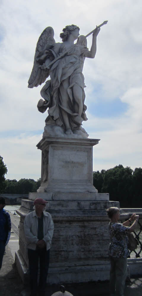 For centuries after the 16th century, the bridge was used to expose the bodies of the executed. In 1535, Pope Clement VII allocated the toll income of the bridge to erecting the statues of the apostles saint Peter and Saint Paul to which subsequently the four evangelists and the patriarchs were added to other representing statues Adam, Noah, Abraham, and Moses. In 1669 Pope Clement IX commissioned replacements for the aging stucco angels by Raffaello da Montelupo, commissioned by Paul III. Bernini's program, one of his last large projects, called for ten angels holding instruments of the Passion: he personally only finished the two originals of the Angels with the Superscription "I.N.R.I." and with the Crown of Thorns, but these were kept by Clement IX for his own pleasure. They are now in the church of Sant'Andrea delle Fratte, also in Rome. The Angel that I photographed is the Angel with the Lance.