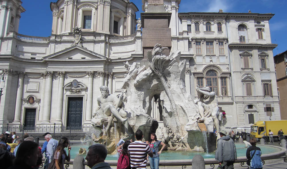 The design of the fountain was first commissioned to Borromini, but it was ultimately handed to his rival Bernini. The fountain features four figures, each representing a river from a different continent - the Nile, Ganges, Danube and Rio della Plata. The statues are at the base of a rock supporting an obelisk, originally located at the Massenzio Circus, near the Via Appia Antica.