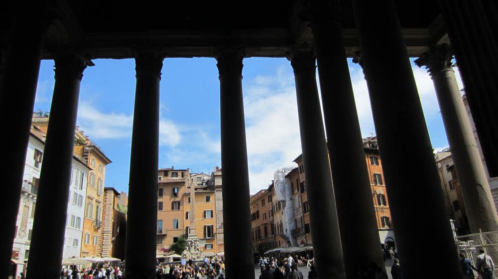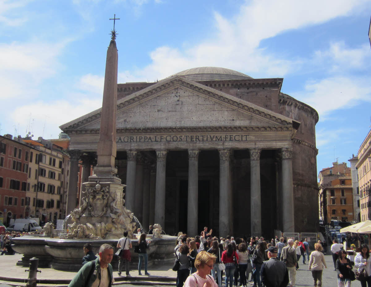 The Pantheon borders the Piazza della Rotonda, a rectangular square with a central fountain and obelisk. The often crowded square is situated in the historic center of Rome, not far from the Piazza Navone, one of Rome's most beautiful squares.