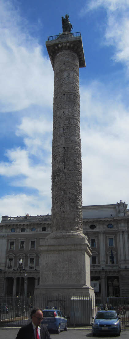 The Aurelian Column is some 30 meter high (100 Roman feet) and formed of 28 blocks of carrara marble. It is put on a large rectangular pedestal - at the time almost 4 meters high - and bears a spiraling band of reliefs depicting events during the imperial campaigns in the north. The lower part shows the campaign against the Germanic tribes between 169 and 173 AD and the upper part shows the campaign against the Sarmatians between 174 and 176 AD.