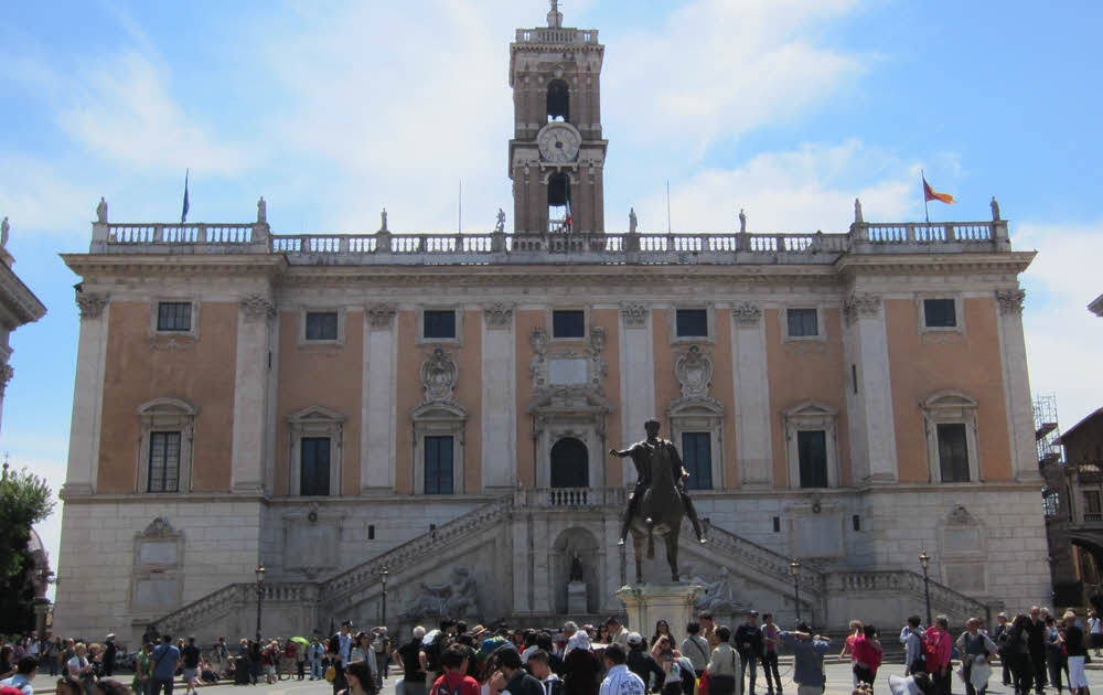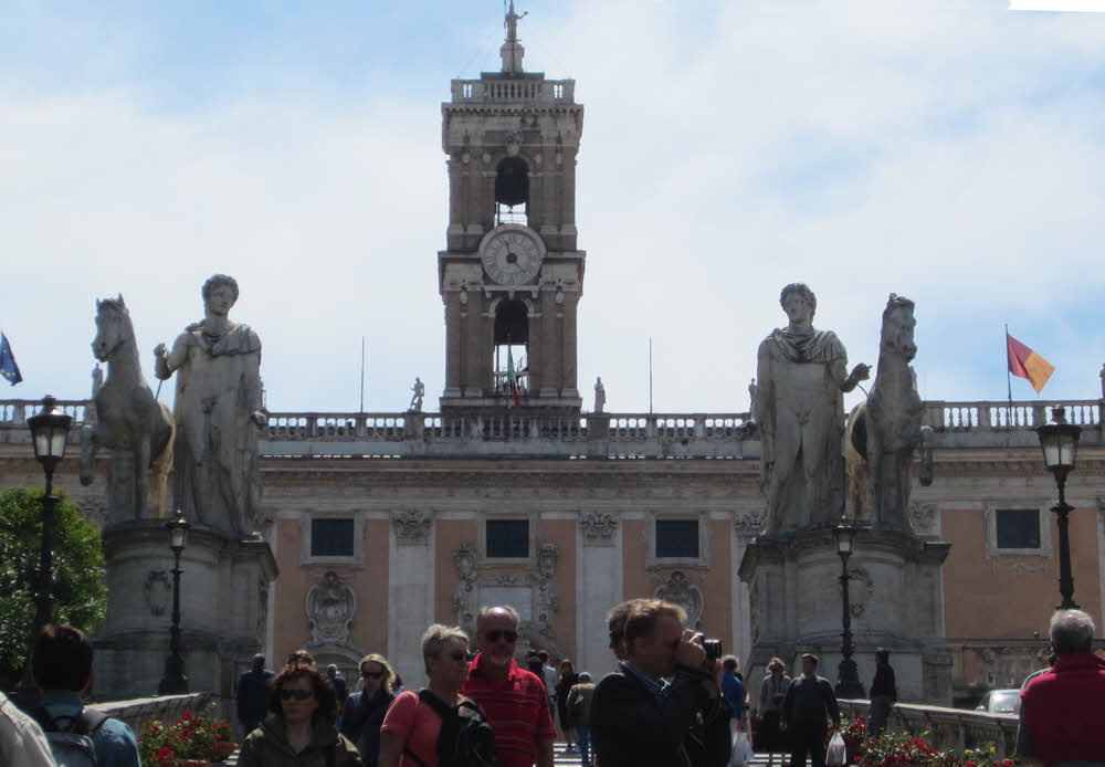 The long, beautiful staircase to the Piazza del Campidoglio is known as the Cordonata. It is adorned with granite statues of Egyptian lions at the foot and two large classical statues of Castor and Pollux at the top.