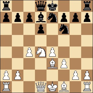 in the centre and his King Bishop is unable to develop to c5 or b4 (as in Smyslov or Breyer's defence).